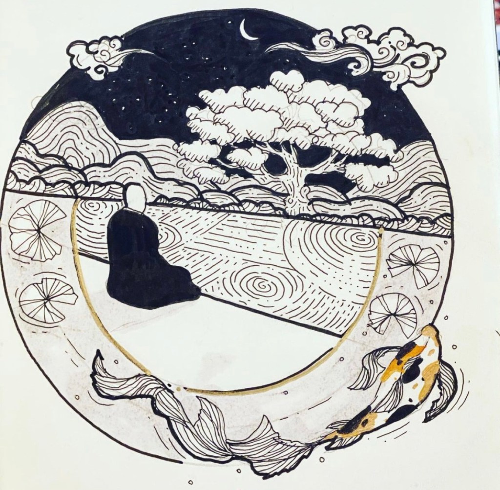 Monk was silent again and Koi turned and swam away looking around and seeing the world anew.